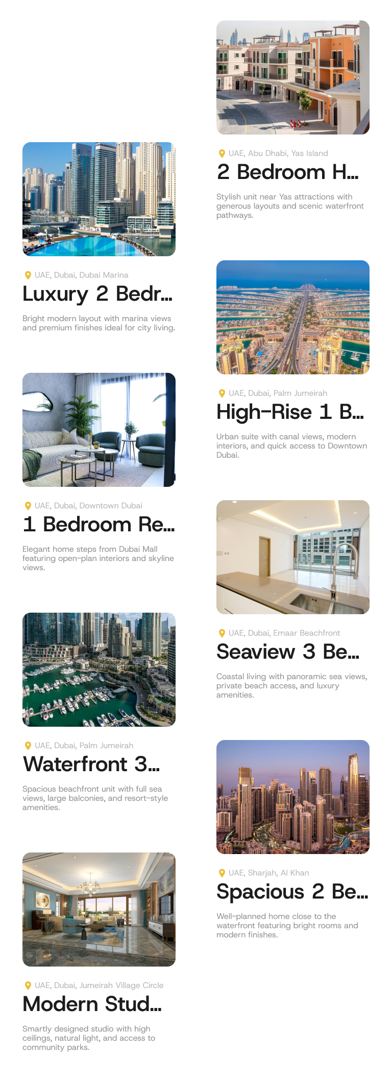Every unit includes full financial and property details: deposit requirements, monthly payment plan, handover date, unit size, bedroom and bathroom count, balcony/garden availability, location, amenities, and more. You see everything upfront, making comparison and decision-making fast and stress-free.